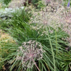 A dome of spiky little florets give this allium a sparkling brilliance. The enormous, 8-10″ globes are violet-pink with a silvery sheen. Christophii blooms in late spring to early summer and the dried seed heads last for months. An ideal choice for rock gardens or pathways where the flowers can be admired up close. Also known as Star of Persia.