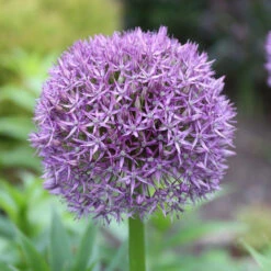 Giant, 10″ diameter violet-purple globes are as big as bowling balls. The largest of all alliums, with dense heads containing hundreds of little florets. Sturdy, 2 to 3 ft stems hold the flowers high above early summer perennials. Weeks of visual excitement for your garden.
