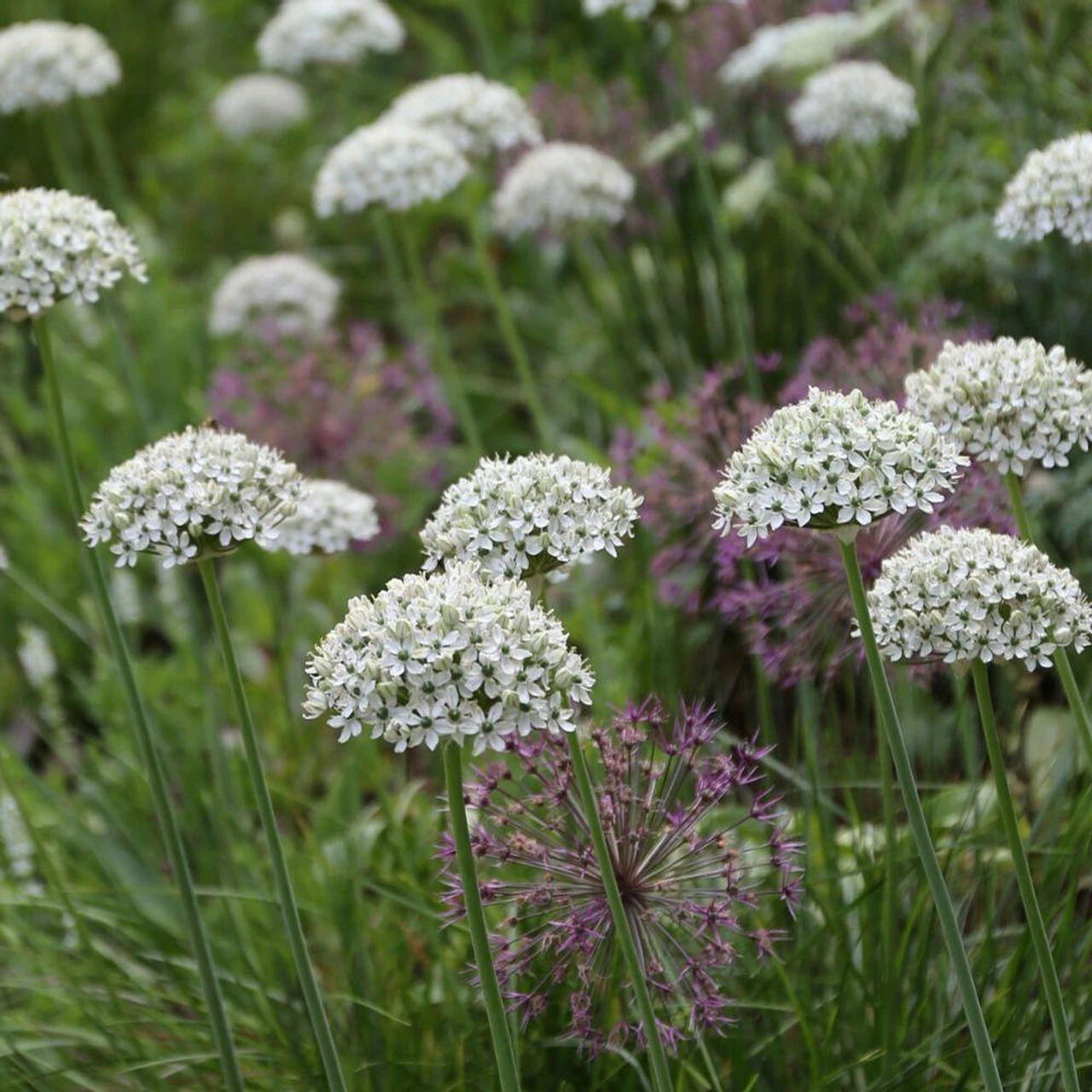 A tall and graceful allium with glistening white domes of six-petaled florets. The flowers are held high on sturdy stems that sway gracefully in the wind. This allium is a beautiful and dependable heirloom for the perennial garden and is also an excellent cut flower. Bloom time is late spring to early summer.
