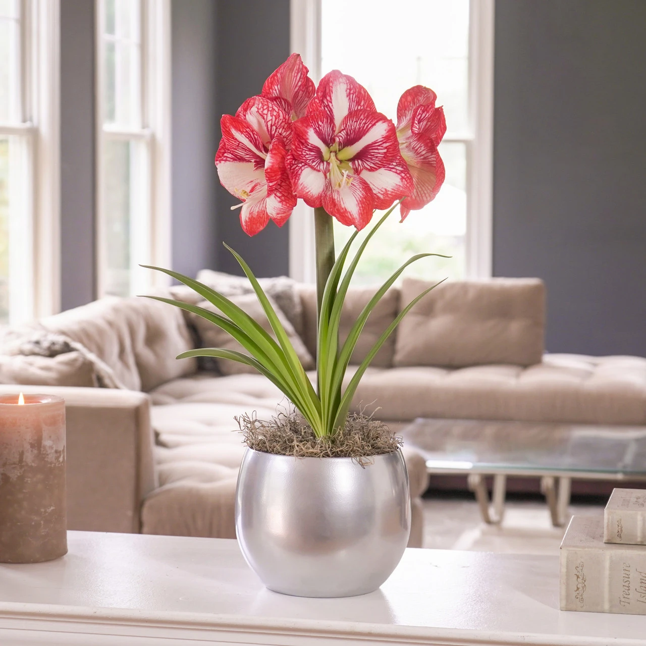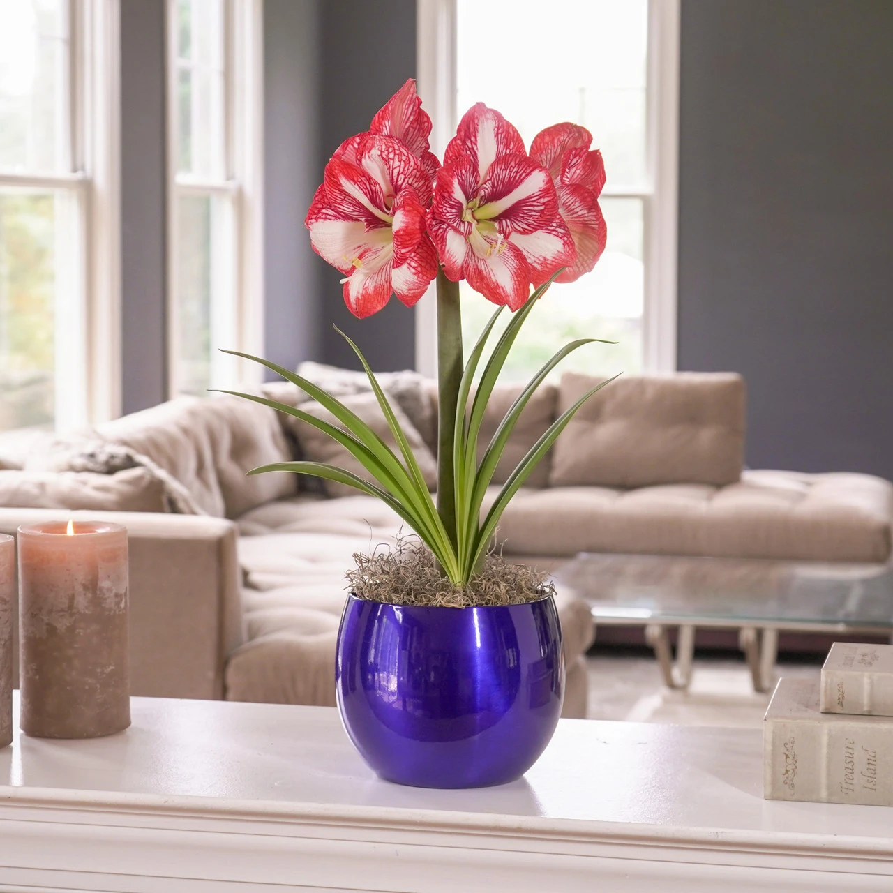 Everyone loves amaryllis, and this gift kit has everything needed to ensure success. The top-size bulb will produce 2 to 3 stems and a total of 8 to 12 beautiful blossoms. Minerva’s brilliant, red and white flowers are a midwinter delight. Select the pot color of your choice: red, blue, or silver.