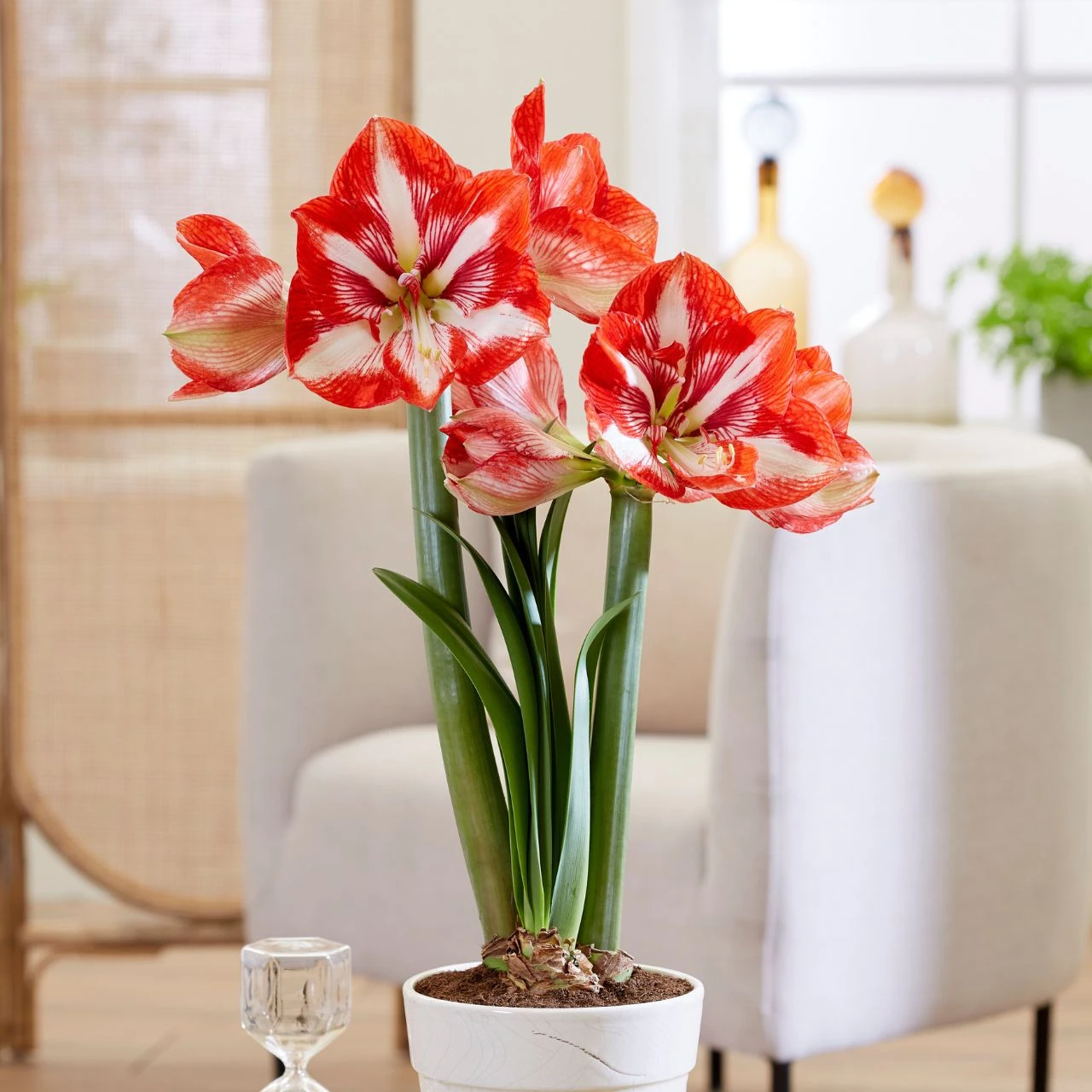Anticipation is part of the fun of growing amaryllis. With Pierrot, you can look forward to enjoying these brilliant, red and white striped blossoms for weeks in midwinter. The flowers measure 8-9″ across and each bulb produces a dozen or more blooms.