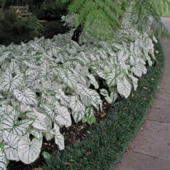 A classic caladium with snow-white, heart-shaped leaves and dark green veins. Candidum is especially dazzling in deep shade and by moonlight, when the leaves are almost luminous. For best results, grow this variety in full to partial shade.