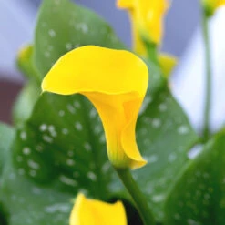 Heat-loving calla lilies are ideal for containers and sunny garden beds. Just plant the bulbs in spring and they will be blooming by mid to late summer. The elegant flowers and attractive foliage complement other summer bulbs such as dahlias and caladiums. Gold Crown’s brilliant yellow flowers are complemented by variegated foliage.
