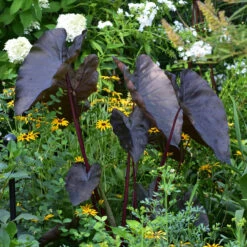A stunning new addition to the world of elephant ears. Diamond Head’s broad, blue-black leaves have a smooth surface and a lustrous sheen that reflects the light. For best color, grow it in full sun. Mature plants reach 3 to 4 feet tall, with leaves up to 2 feet wide.