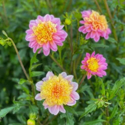 A fancy, two-tone dahlia with lavender-pink petals surrounding a golden yellow center. The compact plants stand just over 2 feet tall and never need staking. Bright, summer-long color for flower beds, borders and pots.
