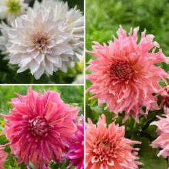 This collection from floral designer Alicia Schwede includes three fabulous dinnerplate dahlias. Alicia composed this arrangement using Longfield Gardens varieties grown in her own garden. Cream and pale pink Break Out hits the high note, with Penhill Watermelon and Penhill Dark Monarch providing the frills and deeper tones. All of these varieties have big, 8 to 10″ blossoms and will bloom from August to frost.