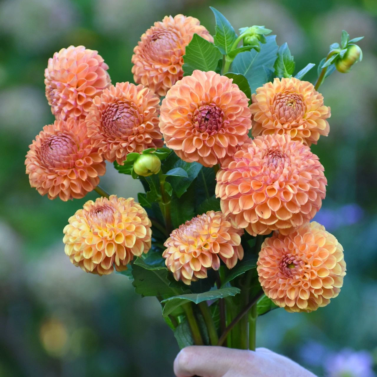Many dahlia lovers have Cornel Bronze on their top 10 list. These 3-4” ball-style flowers are big and burly, with strong stems and a long vase life. The plants produce an astonishing number of coppery-orange blossoms that look great with every color in the garden.