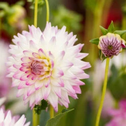 These creamy white flowers, tipped with lilac-purple, add a fresh look to bouquets and flower beds. The spiky, cactus-style blooms look beautiful mixed with glads, lilies and other late summer flowers. Like all dahlias, Jura blooms continuously from summer through fall.
