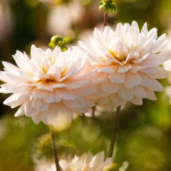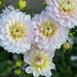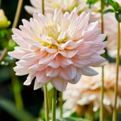 This dahia’s flowers are the color of dawn: blush pink with just a hint of lavender and buttery yellow. The sturdy plants grow 24″ tall and are covered with 4-5″ blossoms from midsummer on. A good variety for planting along a walkway, at the front of a flower border or in containers.