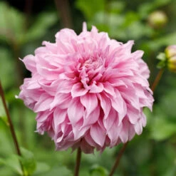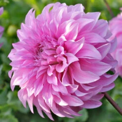 This distinctive dinnerplate dahlia has enormous pink flowers with hints of violet and lavender. Vassio Meggos’ petals taper to a point and curl as they arch back toward the stem. This gives the blossoms an almost spherical shape, like big pink powderpuffs.
