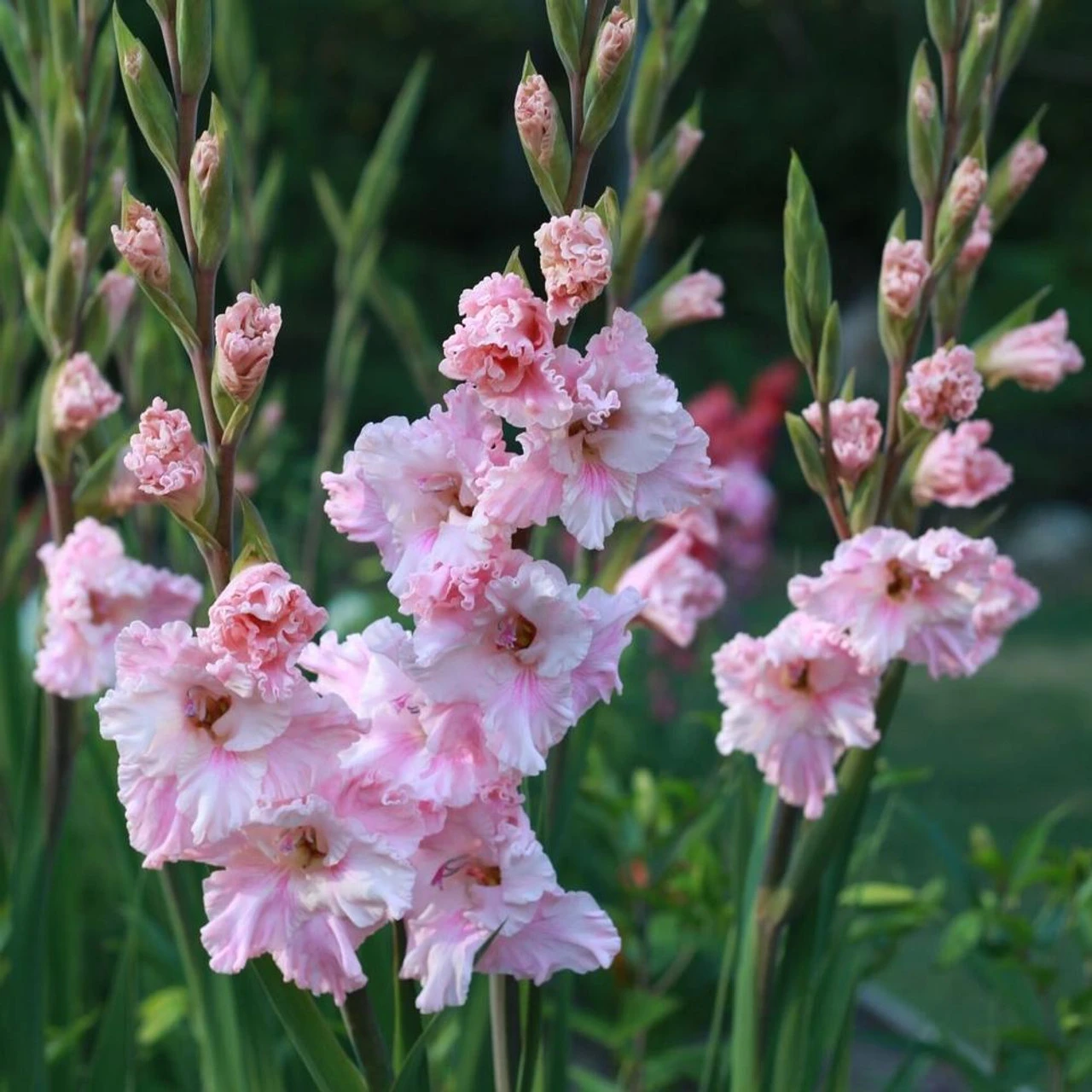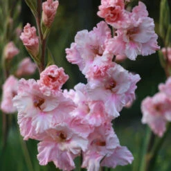 We first saw these fabulous glads in the garden of floral designer Alicia Schwede of Flirty Fleurs. The buds look like miniature pink carnations and the flowers open into a frilly confection of candy pink petals. Each sturdy, 4-foot stalk displays a dozen or more flowers, guaranteeing weeks of color in your garden or in a vase.